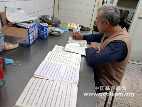 两年前付春华弟兄到中南神学院学生食堂做厨师,一个问题总是缠绕着他,他思想:“做个好厨师、服侍好神学生是他的本分,但这还不够,业余的时间可以为主做点什么呢?”在祷告中,付弟兄得蒙圣灵的启示:“抄写圣经吧”。从此他就利用闲暇时间开始抄写圣经。他把这看为一份圣工,付弟兄和同工分享时说:当时的想法很简单,就是想为主做点事,别忘了神的话语。每当他抄写完一章圣经后,都觉得心里说不出的喜乐、身上有用不完的力量。付弟兄的这一举动感动了同工和神学生们,大家都表示要向付弟兄那样渴慕神的话语。