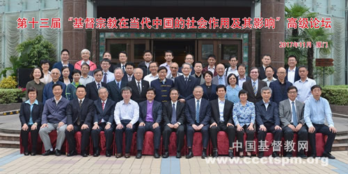 由中央人民政府驻港联络办协调部主办、中国基督教两会承办的第13届“基督宗教在当代中国的社会作用及其影响高级论坛”,于2017年11月14日在福建省厦门市召开,47位来自香港和内地的嘉宾参加本次论坛。中央人民政府驻港联络办协调部副部长张强、中国基督教三自爱国运动委员会主席傅先伟长老、福建省委统战部副部长翁雄宇、国家宗教事务局研究中心副主任雷丽华、中共中央统战部二局基督教处处长倪智泉出席开幕式,中国基督教协会驻会副会长单渭祥牧师主持开幕式。