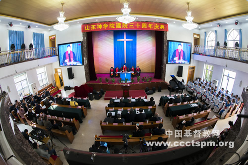 山东神学院建院三十周年庆典礼在学院礼拜堂举行,李洪玉牧师主持。李牧师介绍了出席的领导、嘉宾并致欢迎词。中共中央统战部二局七处倪智泉处长、国家宗教局四司院校处王蕾处长、省宗教事务局岳富强副局长、香港基督教文化学会会长李志刚牧师、台湾中华基督教两岸交流协会理事长魏悌香牧师、联合圣经公会中国事工部张玉珊女士先后受邀致辞。倪智泉处长在致辞中肯定了山东省基督教两会在神学研究和人才培养上所作出的成绩,缓解了山东教会人才青黄不接的局面。但面对全省基督教的迫切需要,还要倾注更多人力物力来做好神学教育工作,更新办学理念和教学方法,积极探索人才培养的多种模式,为教会培养适合不同阶层需要的专业人才。王蕾处长在致辞中强调十九大会议对宗教工作的高度重视和关心,希望省基督教两会重视师资建设,加强内部管理,以三十周年为契机,明确办学目标,提高办学水平,以国家宗教政策方针为指导,努力做好推进基督教中国化的理论和实践工作。岳富强副局长对山东省基督教两会近年来在办好宗教院校工作方面取得的成绩表示祝贺,希望本届班子继续做好依法办学,推进神学思想建设,做好对异端、极端思想的抵制工作,不断培养神学生的民族自豪感和社会责任感。李志刚牧师以马丁·路德爱国爱教的改教精神为例,鼓励大家做好儒家文化与基督教精神的融合,建立于教会和国家有益的基督教神学,合力推动基督教中国化。魏悌香牧师以直跑、快跑、同跑鼓励大家不忘初心、努力付出、同心合意作好上帝所交付的事工。张玉珊女士介绍了联合圣经公会的各项事工,并希望继续保持与山东的友好合作,共同做好主的事工。随后王孟坤牧师宣读了境内外友好单位和友人发来的贺电,贺电中表达了对庆典的祝贺与对神学院未来发展的祝福。